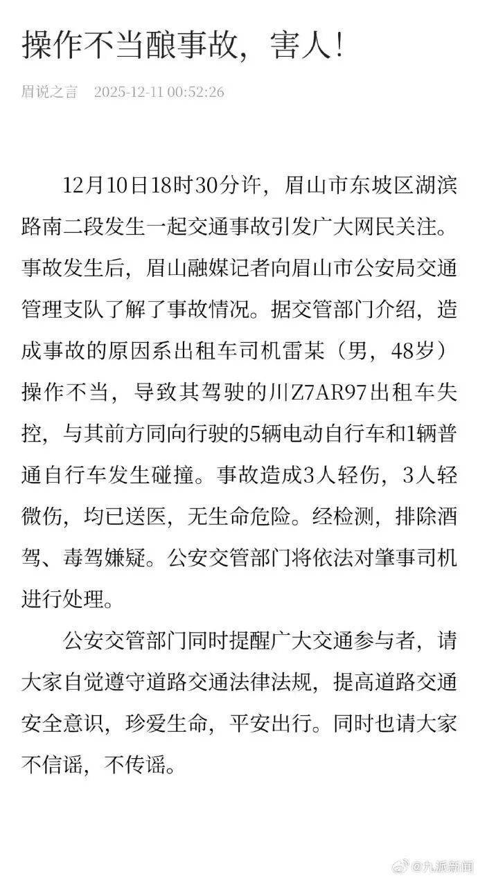 12月10日18时30分许,眉山市东坡区湖滨路南二段发生一起交通事故引发广大网民关注。事故发生后,眉山融媒记者向眉山市公安局交通管理支队了解了事故情况。据交管部门介绍,造成事故的原因系出租车司机雷某(男,48岁)操作不当,导致其驾驶的川Z7AR97出租车失控,与其前方同向行驶的5辆电动自行车和1辆普通自行车发生碰撞。事故造成3人轻伤,3人轻微伤,均已送医,无生命危险。经检测,排除酒驾、毒驾嫌疑。公安交管部门将依法对肇事司机进行处理。