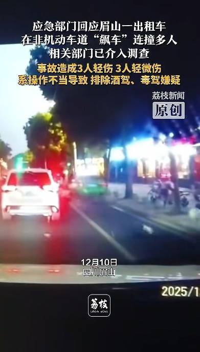 此前据媒体报道,12月10日,四川眉山一辆车牌为川Z7AR97的出租车,从右侧非机动车道快速冲出,先撞翻前方正常行驶的电动自行车,随后又撞上左侧机动车道的一辆白色轿车,最终熄火停住。网络流传的现场视频显示,事故发生后,有人倒地不起,而涉事出租车司机仍坐在驾驶室内。